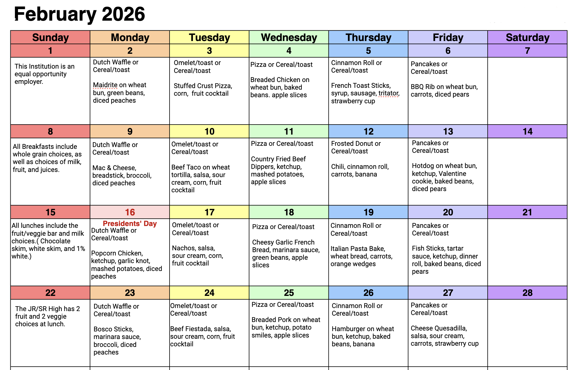 Here is the February breakfast & lunch menu. The menu is subject to change.